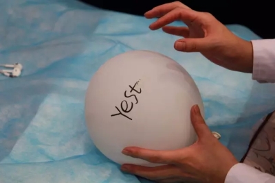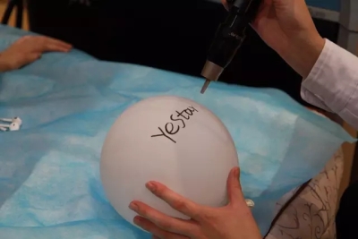 开始前,首先在气球上进行镭射激光,可以看到,镭射前的气球上完整的写着,几秒钟不到,在气球上轻轻的点了几下之后,气球上的6个字母明显少了2个,并且气球没有丝毫的破损,足以说明镭射激光对皮肤的刺激是微弱的。