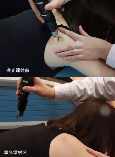 镭射过程持续了大概十几秒,三厘米左右的纹身,十下左右就结束了,并没有明显的痛感,结束后可以明显看出纹身的黑色素都被镭射激光吸收了,只留下了很浅的白色印记,称,印记会在几天内消除,而随后皮肤将会变得光滑白皙。期待ing...