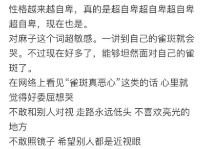 下面是知乎上的一个话题“脸上有雀斑是种什么体验”以下是脸上长雀斑的mm的内心真实声音: