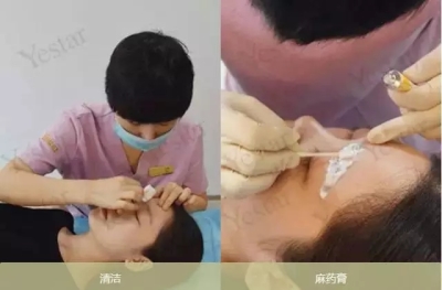 清洁眉毛及周边区域,同时为减少不适感,上色前涂抹一些表面麻醉膏
