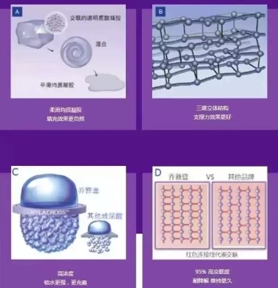 乔雅登区别于其他玻尿酸的最大不同在于构造。普通玻尿酸是颗粒状的,交联度没有乔雅登高。而乔雅登是粘稠性液体,浓度高,呈凝胶状,而且交联度大。后效果可保持12-18个月。