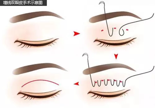 埋线双眼皮就是采用缝线直接把皮肤与睑板之间缝合在一起,结扎线固定于上睑真皮和睑板前或睑板上缘上睑提肌腱膜间,以此来形成双眼皮,皱襞外形自然。