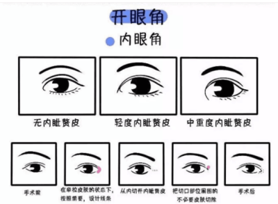 通常所说的开眼角,一般都是指开内眼角手术,也叫内眦成形术,开内眼角并不是真正的打开内眼角,只是把挡在内眼角前面的内眦赘皮打开,露出里边的眼角结构。